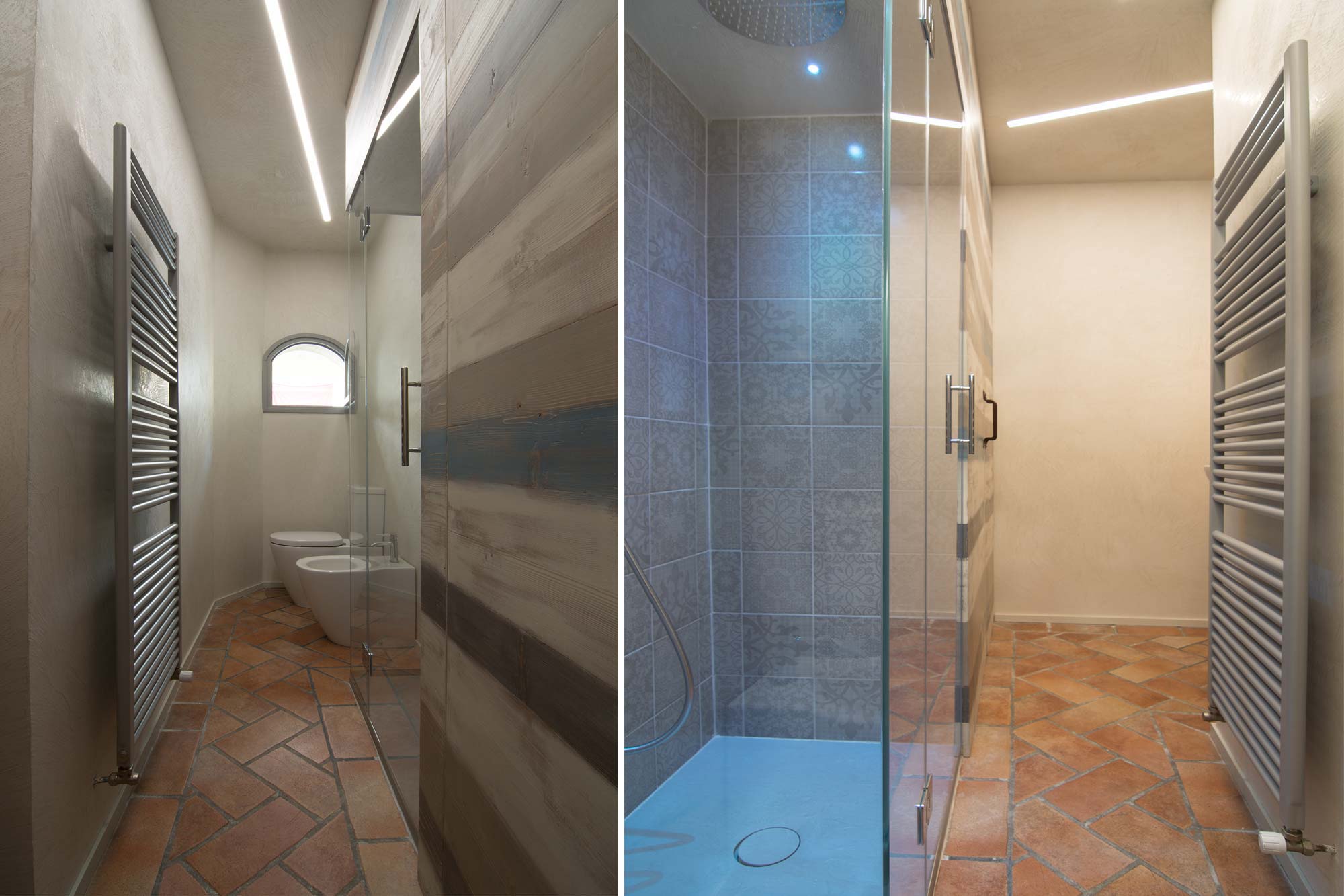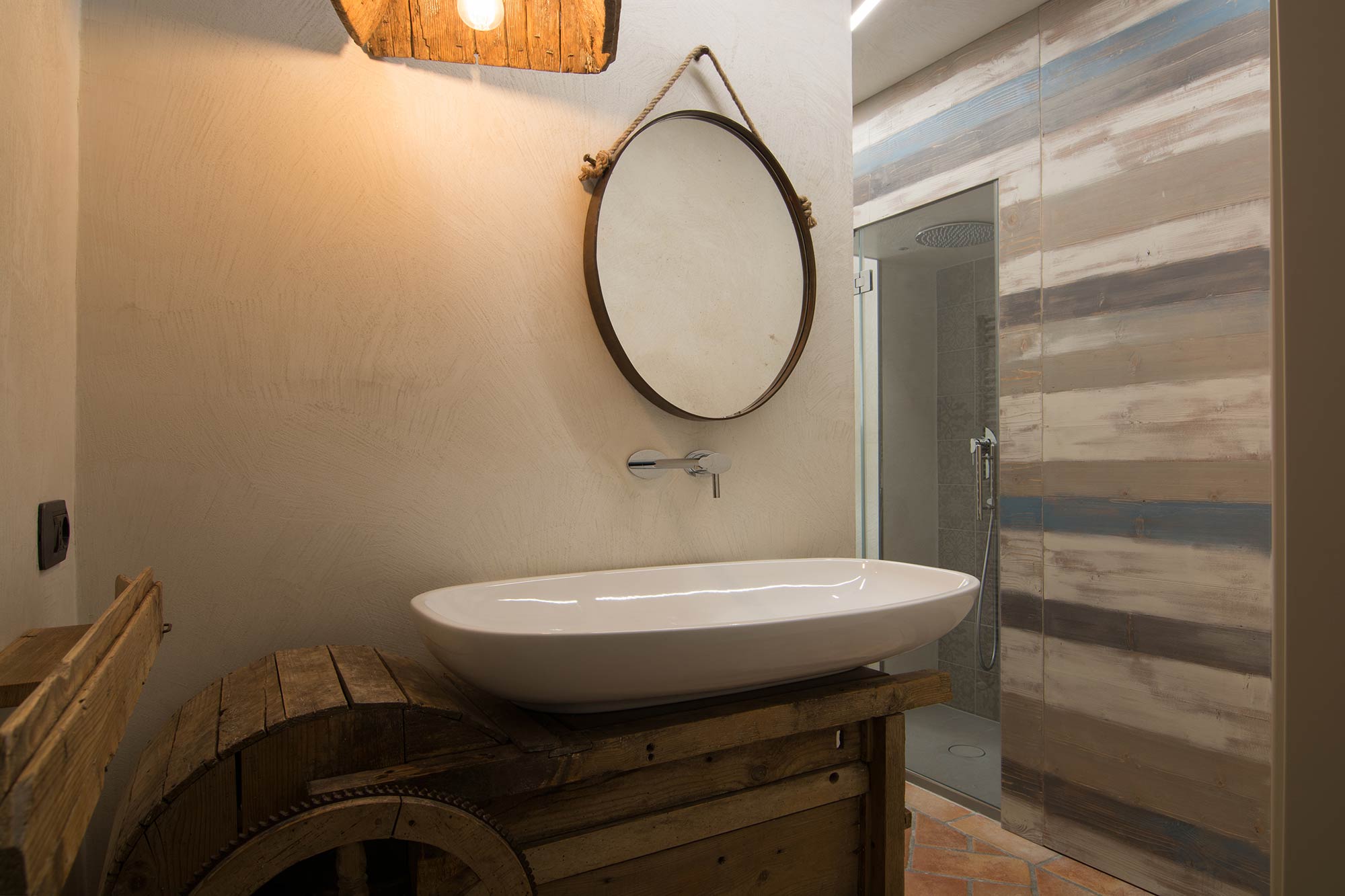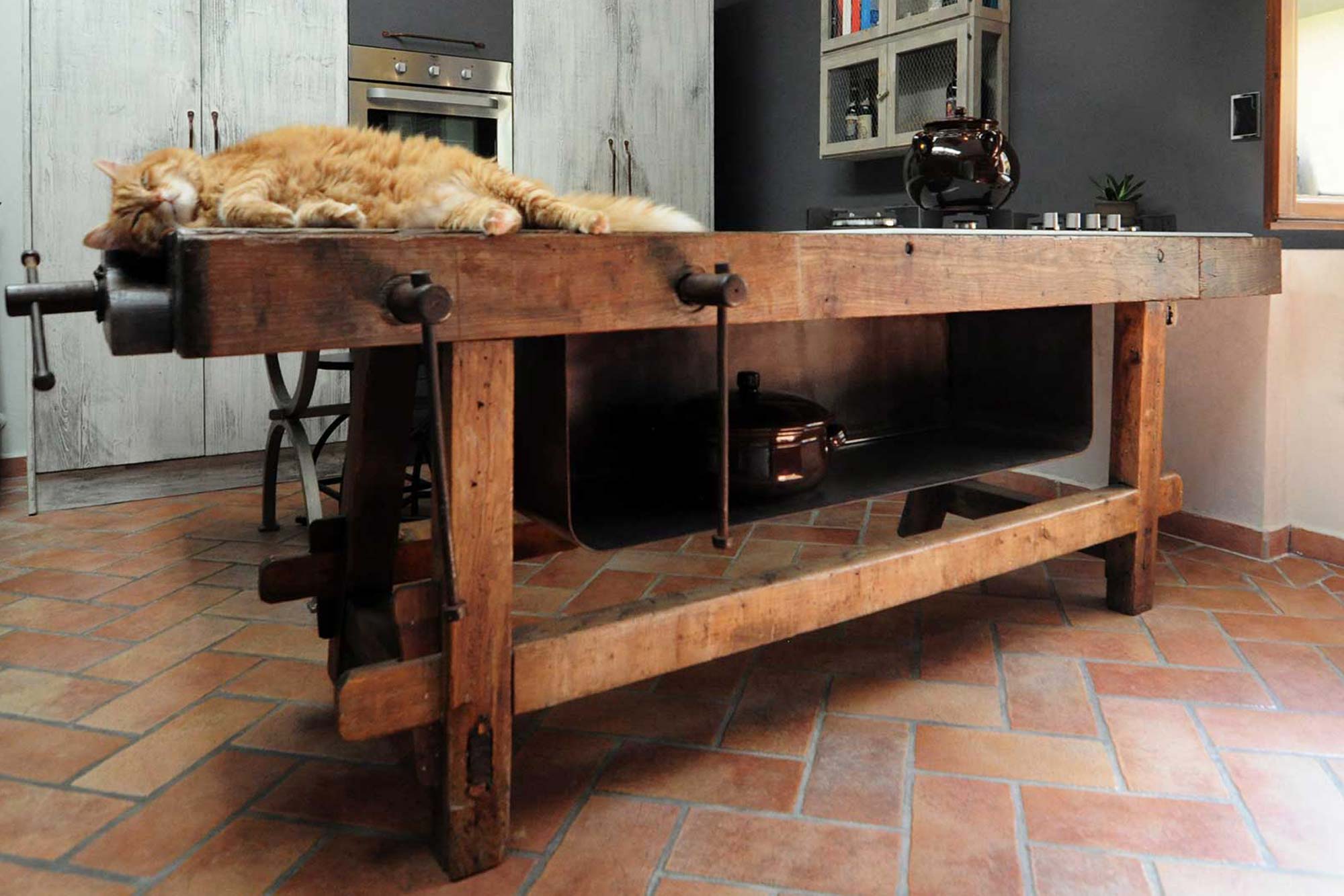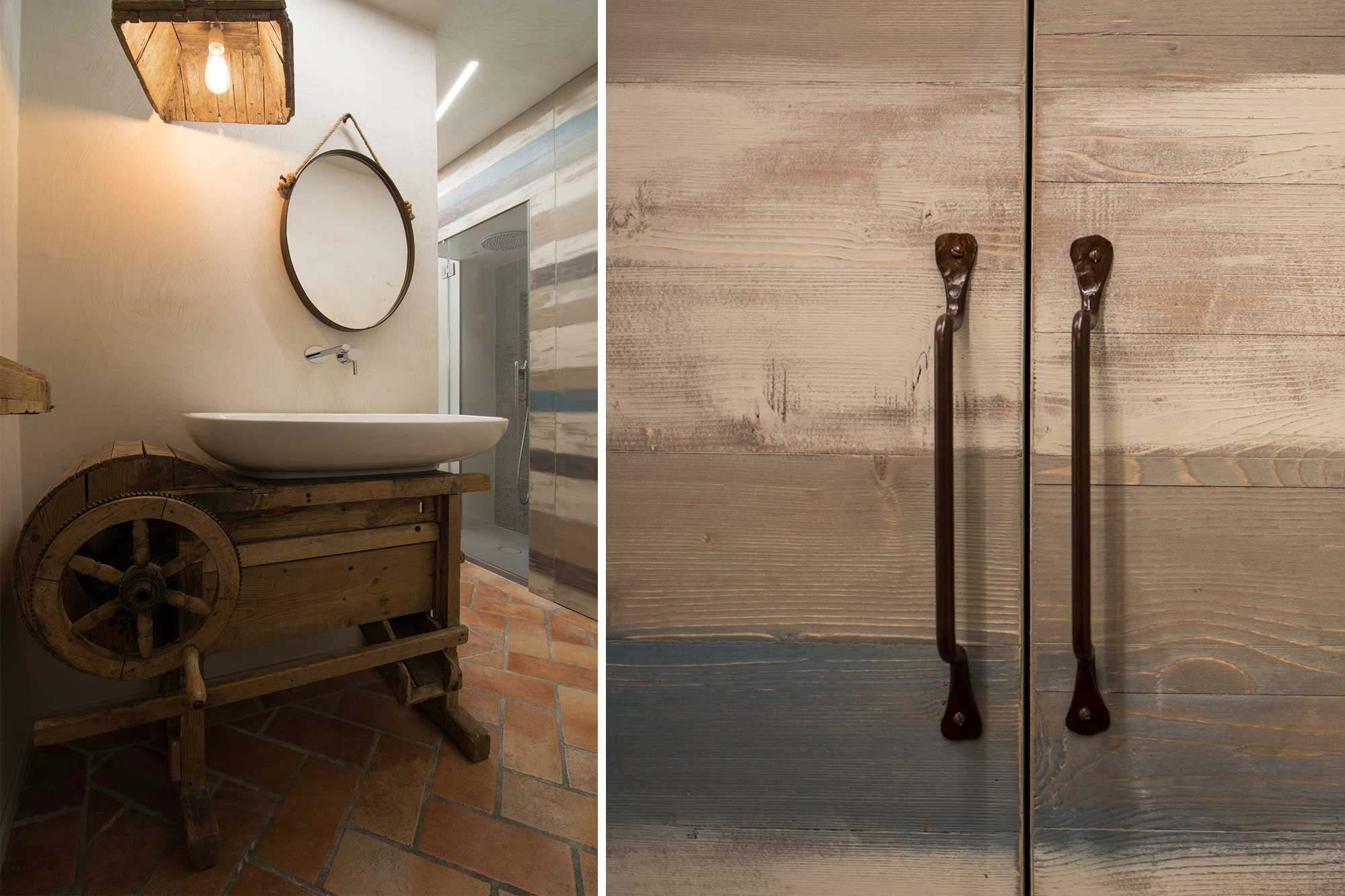 Legno, ferro e materiali di recupero sono stati il punto di partenza per il mood progettuale. Il piano dei fuichi è un vecchio tavolo da falegname riadattato, il mobile del bagno invece è stato realizzato modificando un vecchio attrezzo agricolo. Lo stesso dicasi per l'originale lampada del bagno. Progetto architettonico, interior design, lighting design, concept, home shopping e direzione del cantiere e direzione artistica dei lavori a cura di Rachele Biancalani Studio - Progetti e immagini coperti da Copyright All Rights reserved copyright 2013 © Rachele Biancalani - Foto Thomas Harris Photographer