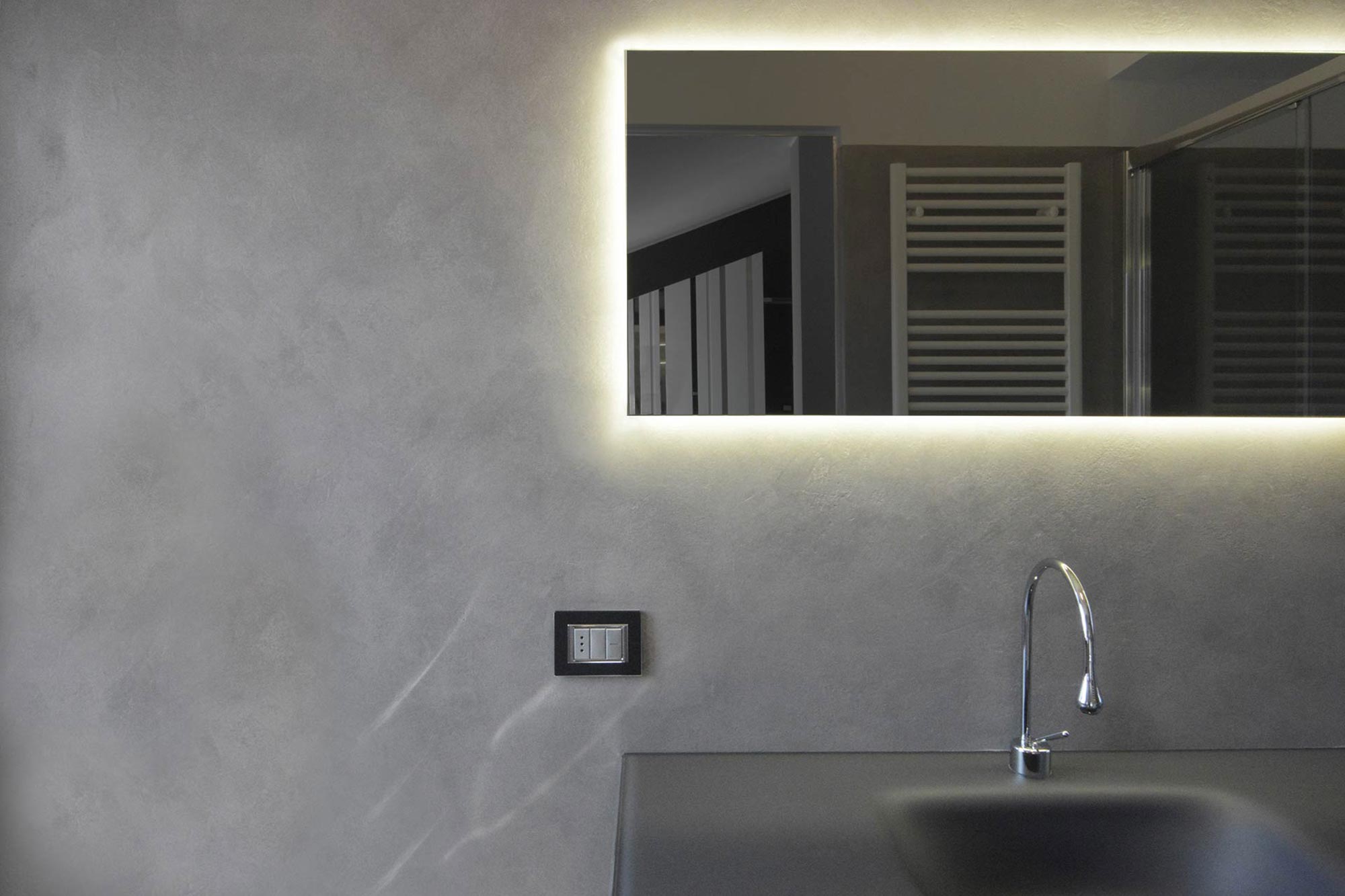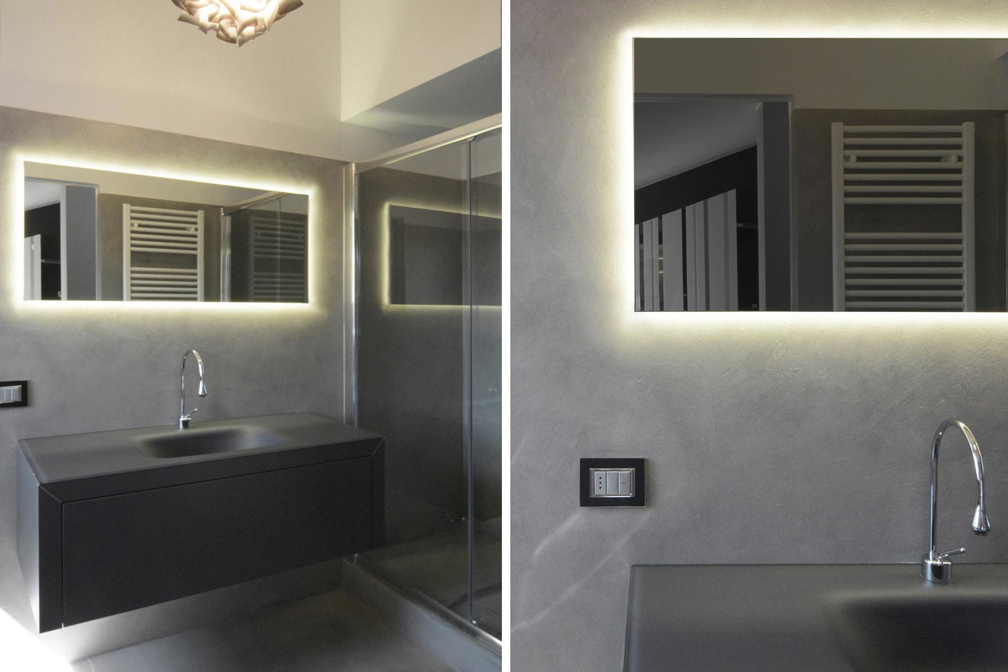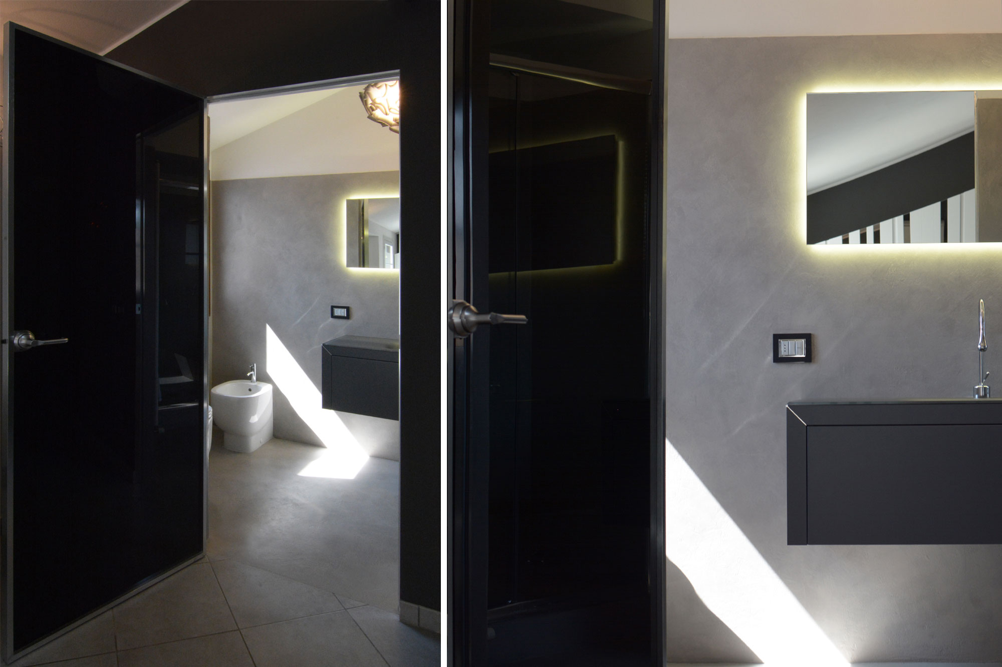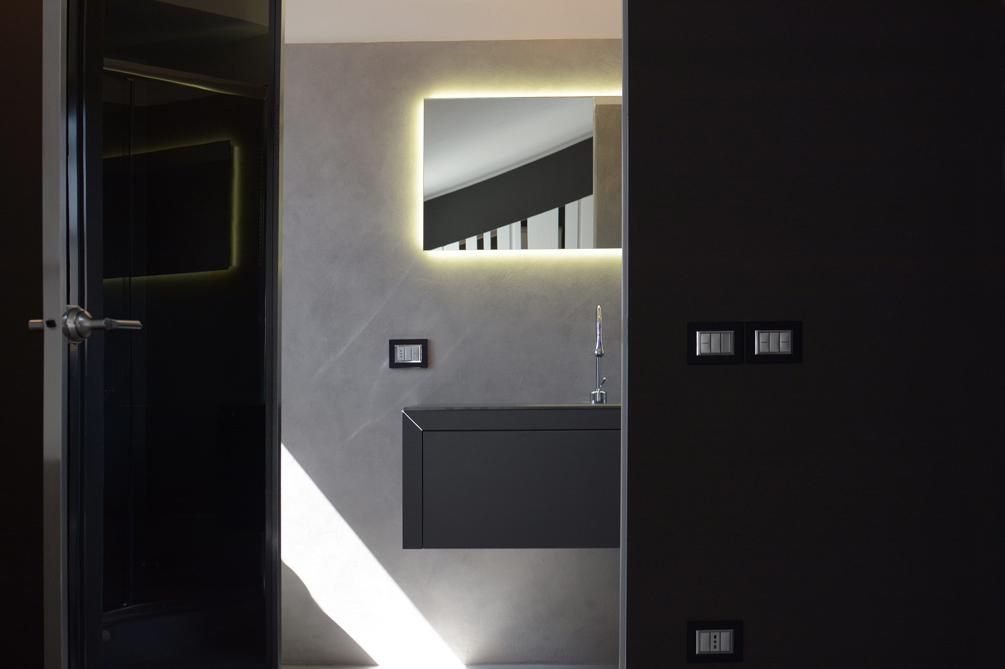 Le particolari armadiature su misura sono stati realizzate su disegno (SHINE, All Rights Reserved 2013 © Rachele Biancalani) ed oltre a creare degli ambienti unici creano giochi di luce e illusioni ottiche particolari. Il look moderno non risulta freddo e impersonale ma elegante e raffinato. Entrambi i bagni dell'appartamento sono stati rivestiti in resina decorativa spatolata con effetto grezzo per eliminare, senza demolire, le dozzinali piastrelle preesistenti.