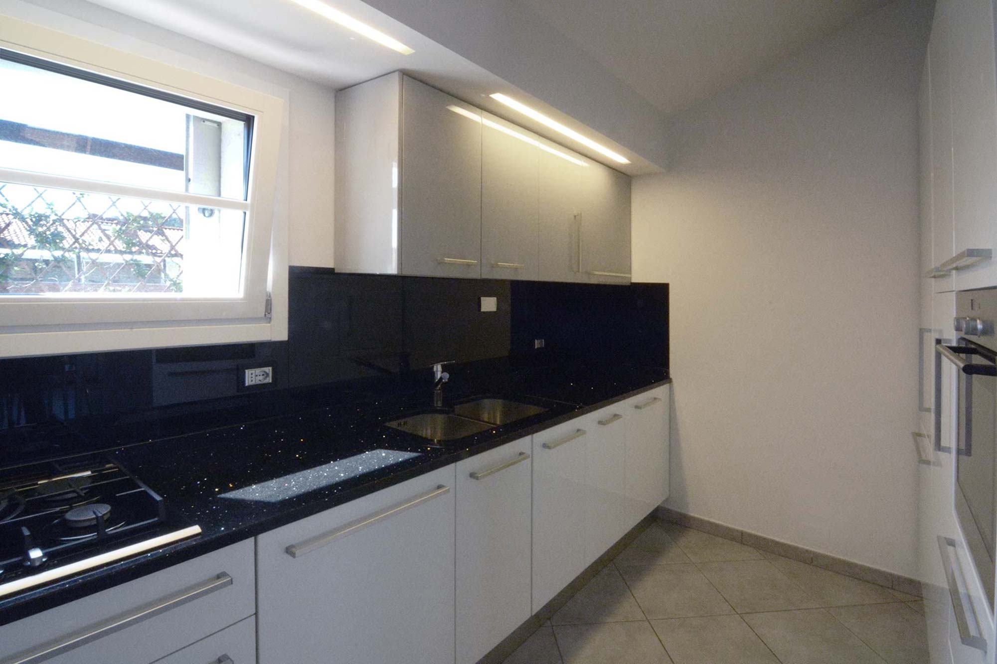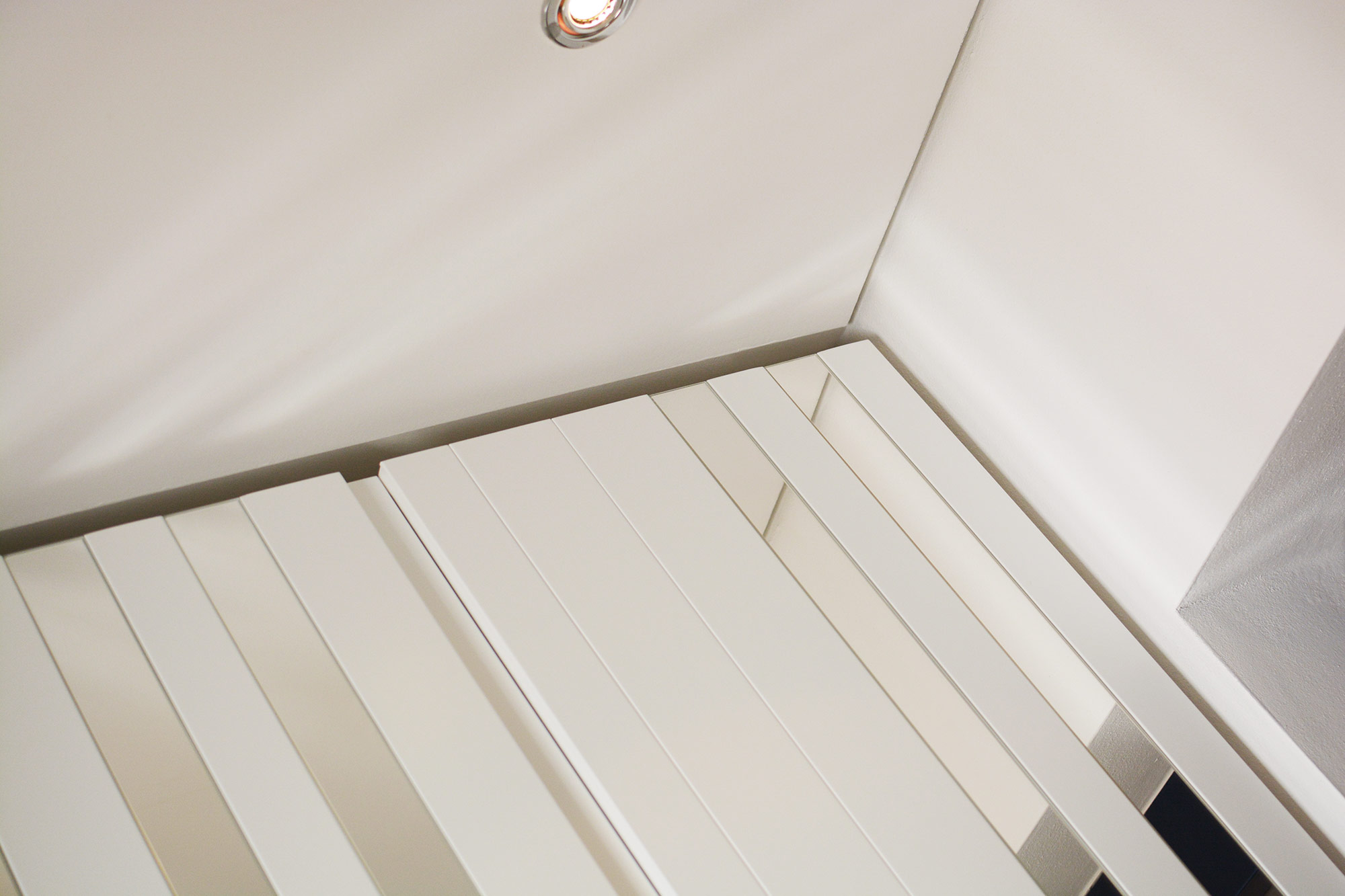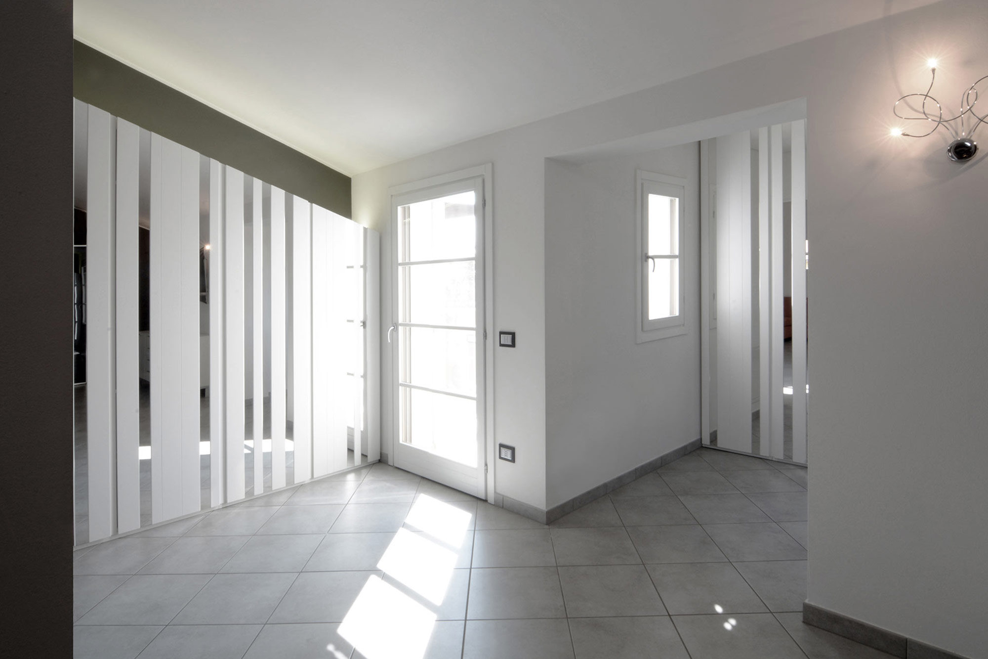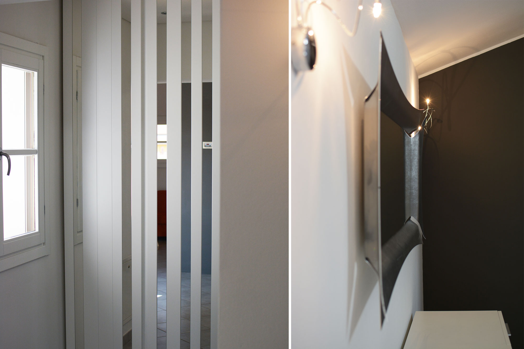 Le particolari armadiature su misura sono stati realizzate su disegno (SHINE, All Rights Reserved 2013 © Rachele Biancalani) ed oltre a creare degli ambienti unici creano giochi di luce e illusioni ottiche particolari. Il look moderno non risulta freddo e impersonale ma elegante e raffinato. Entrambi i bagni dell'appartamento sono stati rivestiti in resina decorativa spatolata con effetto grezzo per eliminare, senza demolire, le dozzinali piastrelle preesistenti.